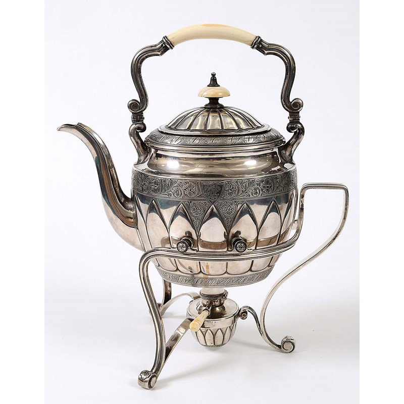 A late 19th century Russian kettle on stand with burner, oval with a mounted ivory finial & swing handle, gilt interior, the body with bright-engraved friezes and a row of pointed lobes around the sides, centred each side with a shield cartouche, monogrammed, the reeded stand with pivot points (to allow the kettle to tilt for pouring), leafy scroll feet and a lift-out burner, with an ivory handly, fully marked, Moscow 1896; 14.9" (37.8 cms) high overall; 88.5 oz
