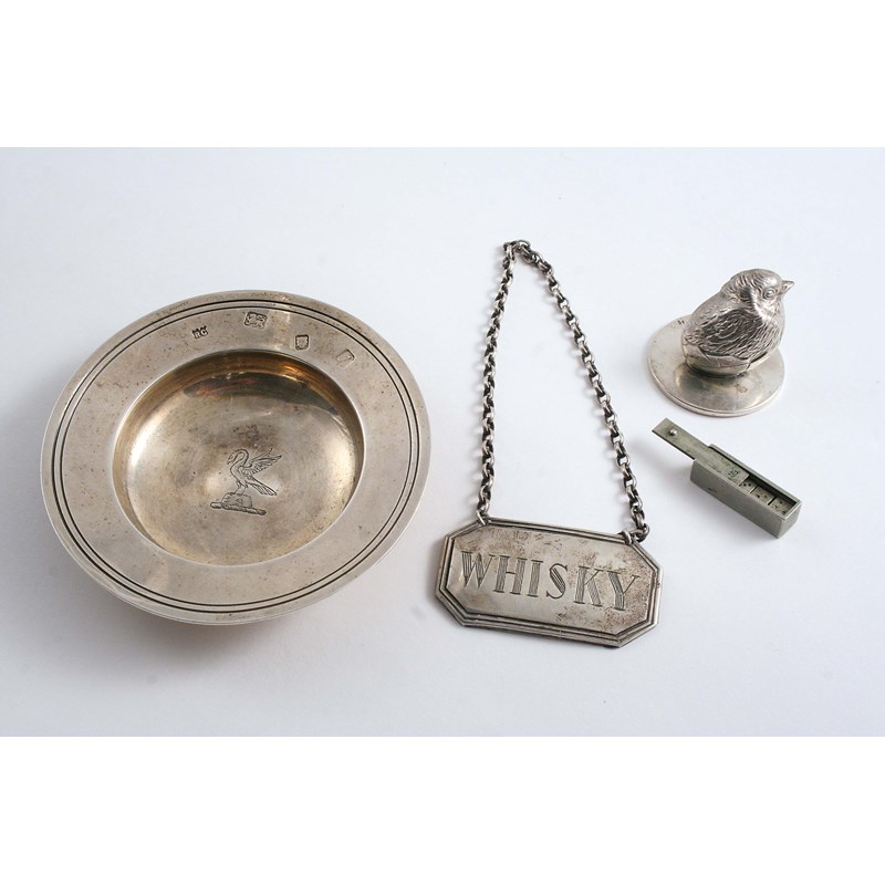 by S. Mordan & Co., Chester 1913, a "Whisky" label, a small dish and a miniature nickel boxed set of dice; the dish 3.2" (8.2 cms) diameter (4)