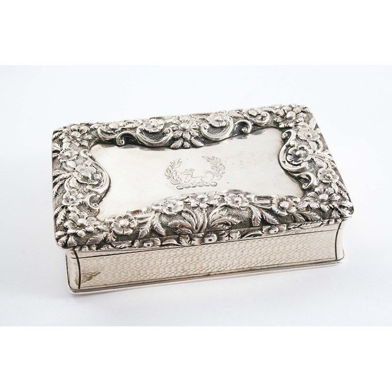 A WILLIAM IV ENGINE-TURNED SNUFF BOX oblong with slightly concaved sides and a large, raised floral border around the cover, crested, gilt interior, by Nathaniel Mills, Birmingham 1833; 2.5" (9 cms) long; 5.75 oz
