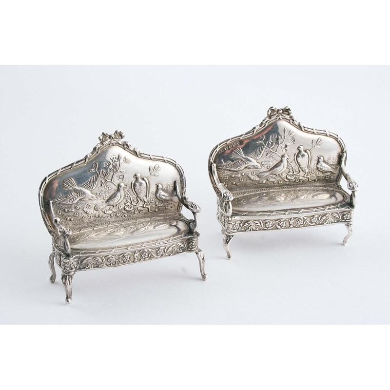 TWO SIMILAR DECORATIVE LATE 19TH / EARLY 20TH CENTURY CONTINENTAL MINIATURE OR TOY SETTEES with doves & tied ribbon surmounts on their backs (one with an English import mark for Sheffield 1901); 2.75" (7 cms) wide; 2.5 oz (2)