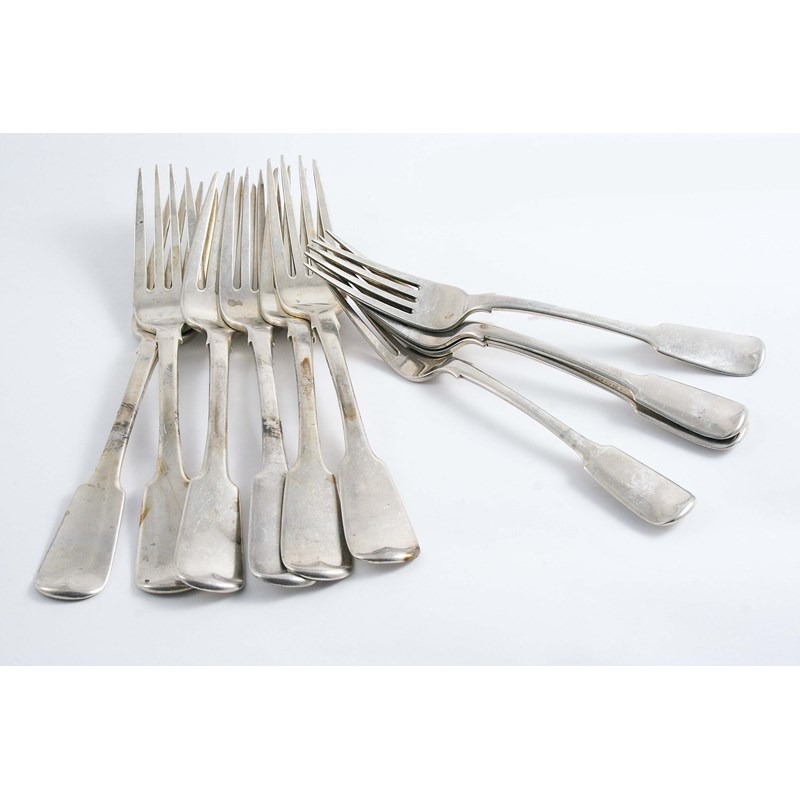 A SET OF SIX SCOTTISH PROVINCIAL FIDDLE PATTERN TABLE FORKS & FOUR DESSERT FORKS crested, by George Booth of Aberdeen (GB, A, B, D, N) c.1820; 21.2 oz (10)