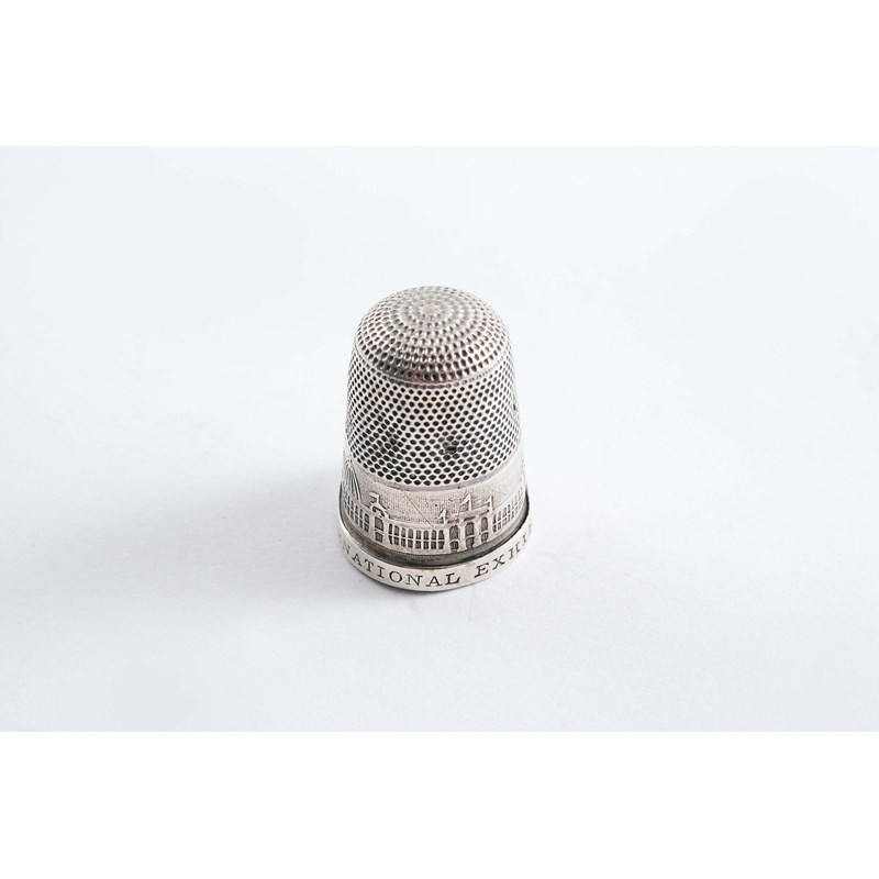 A VICTORIAN THIMBLE stamped with an exhibition building around the sides & incised "INTERNATIONAL EXHIBITION 1862"; 0.9" (2.4 cms) high; 0.1 oz