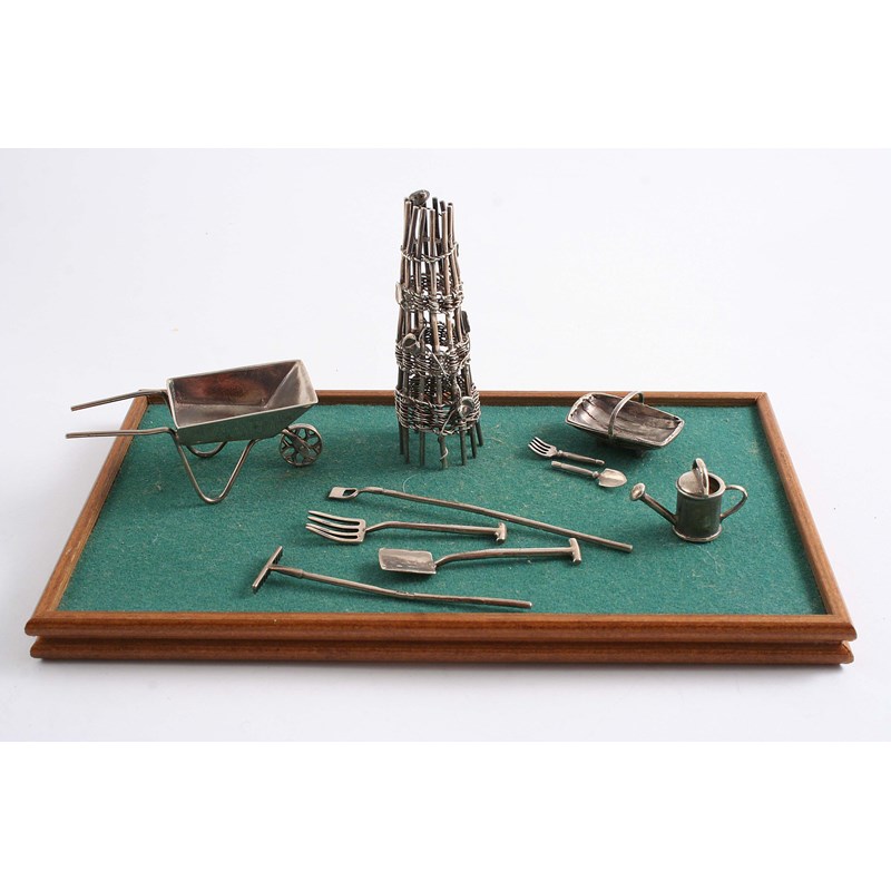 a woven cane tower, a wheelbarrow, a trug, a fork, a rake, a hoe, a spade, a hand trowel & fork & a watering can (with a wooden display base), maker's mark "SJH", Sheffield 1997-2003; the wheelbarrow 2.6" (6.5 cms) long; 2.3 oz (10)