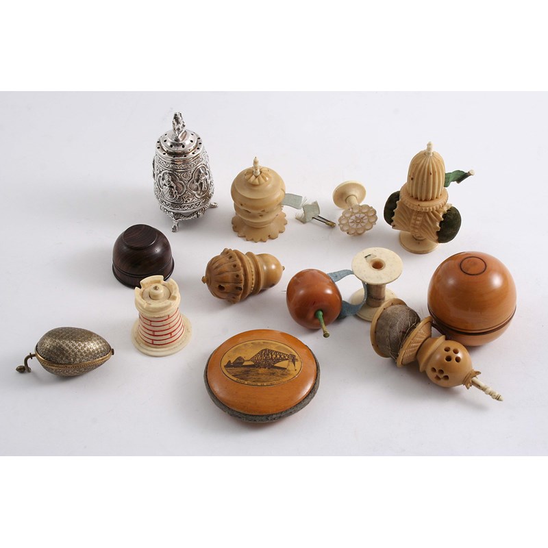 in various mediums, an Indian pepperette, a Mauchlinware pin cushion etc.; the latter 2.1" (5.2 cms) diameter (lot)
