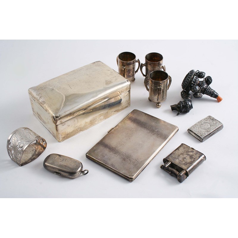 A Cigarette box, wood lined, by C & R. Collis, London 1918, a cigarette case, a napkin ring, inscribed, a double sovereign case, initialled & dated "1906", a small Victorian snuff box, inscribed, a Victorian child's rattle, three German liqueur tots, and a plated Dunhill lighter; the latter 2.1" (5.3 cms) high; 13.3 oz weighable silver (lot)