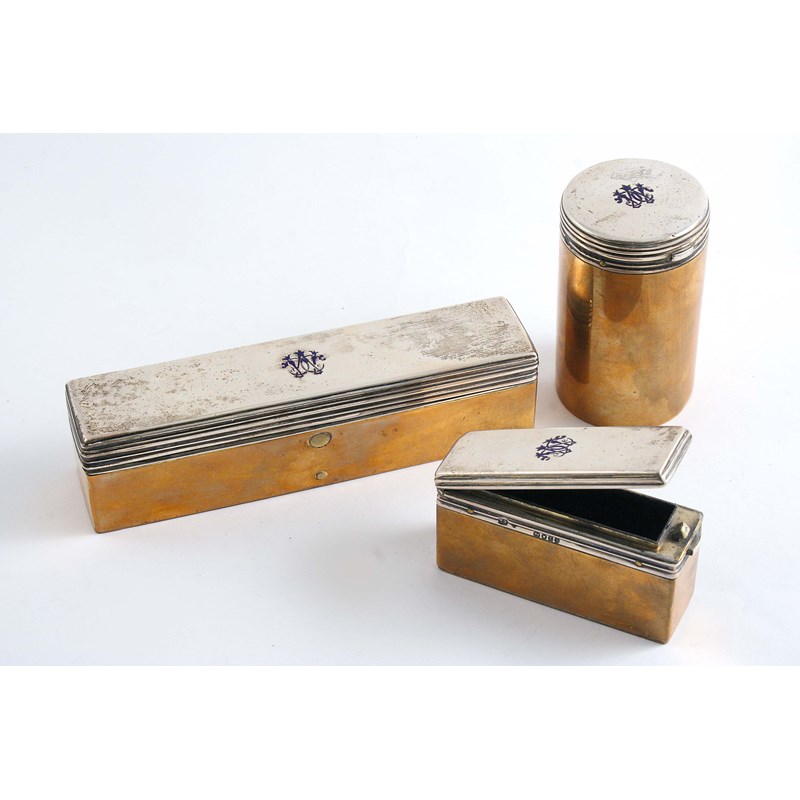 (Two oblong & one cylindrical), each with button-operated hinged covers, & an enamel monogram, by Thomas Johnson, London 1861; the longest one 5.9" (15 cms) long (3)