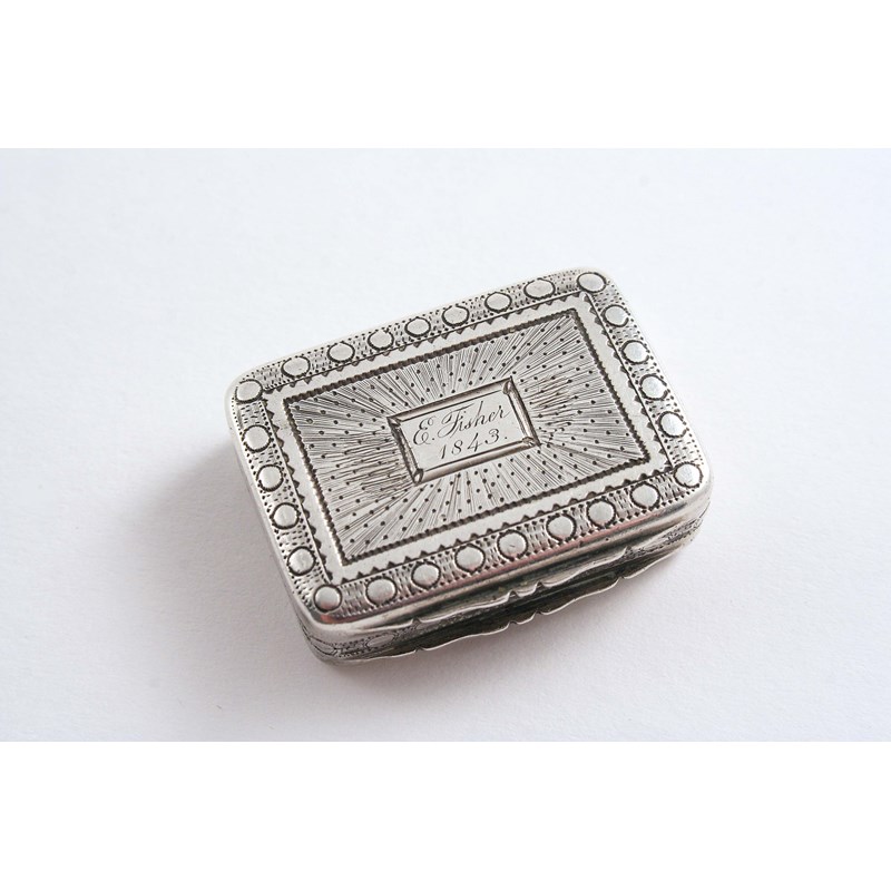 the cover & base with a rayed design & a border of pellets, the cartouche inscribed "E. Fisher 1843", gilt interior & a simulated filigree grille, by Matthew Linwood, Birmingham 1818; 1.25" (3.2 cms) long; 0.5 oz