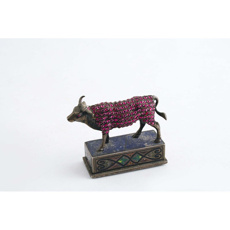 A SILVER COLOURED METAL FIGURE OF A BULLOCK the body set with pink pastes, on a lapis base with silver & enamel sides, probably Austro-Hungarian, c.1900; 7 x 5.5 cms