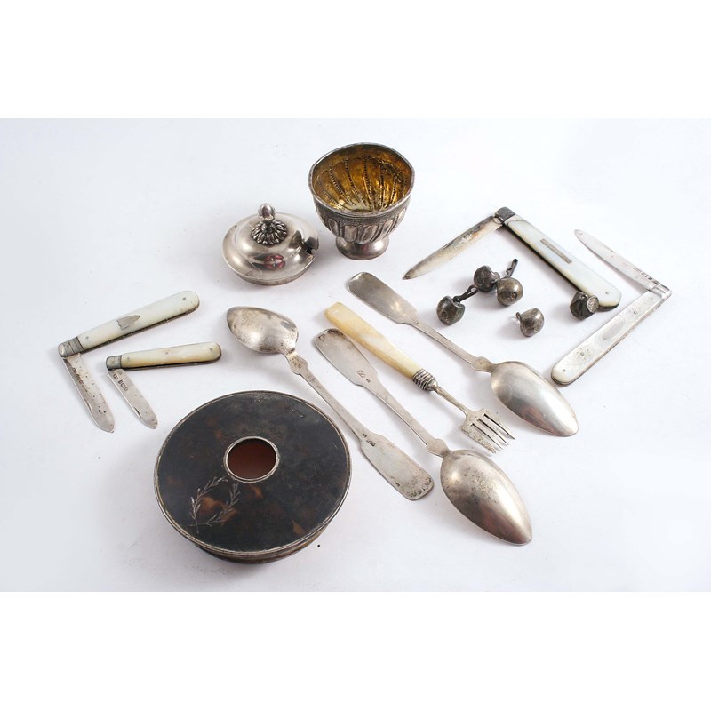 Four mother of pearl mounted folding fruit knives, a fork, three various tea spoons, six buttons, two covers & a small antique drinking goblet inset with a coin; the latter 2" (5 cms) high; 5.1 oz weighable silver (17)