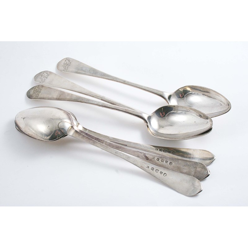 A SET OF SIX GEORGE III SCOTTISH TABLE SPOONS with a pointed end, initialled "AEF", by an unascribed maker "Mc", Edinburgh 1796; 13.9 oz (6)