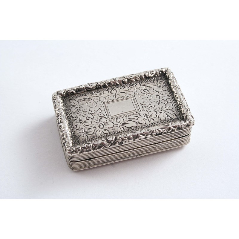 with reeded sides & a raised floral border around the cover, vacant cartouche & gilt interior with a floral scroll grille, by Thomas Shaw, Birmingham 1831; 1.5" (3.9 cms) long; 0.75 oz