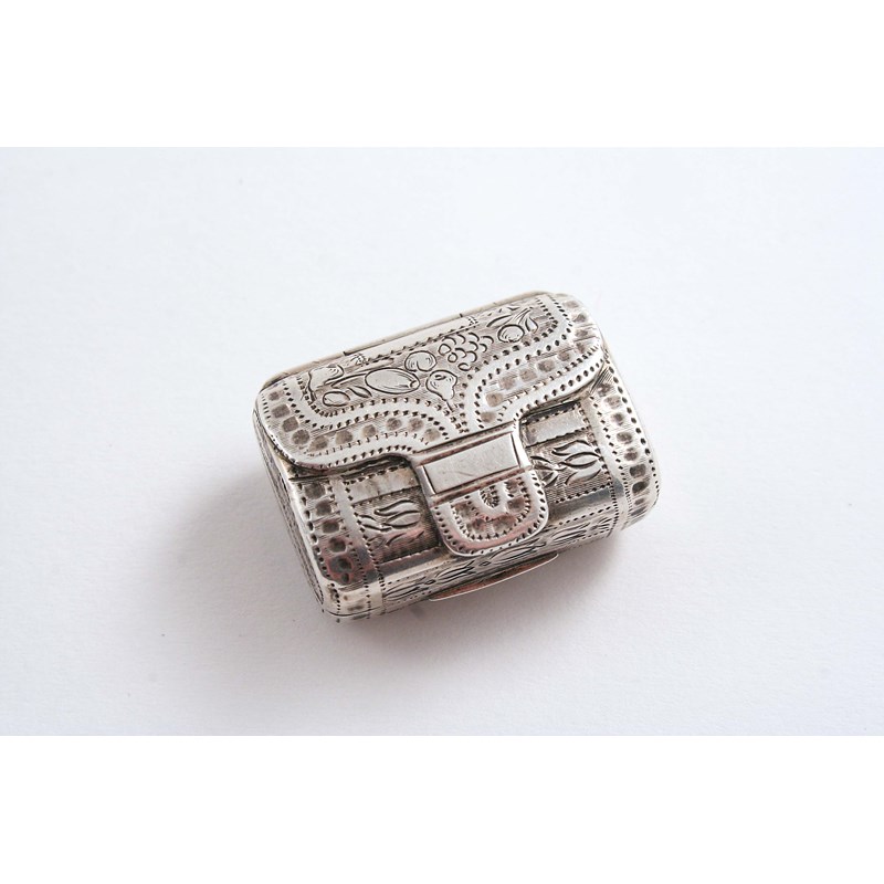 A GEORGE III ENGRAVED VINAIGRETTE in the form of a clutch bag, gilt interior, the grille pierced with lovebirds, by John Lawrence, Birmingham 1817; 1.1" (2.3 cms) long; 0.33 oz