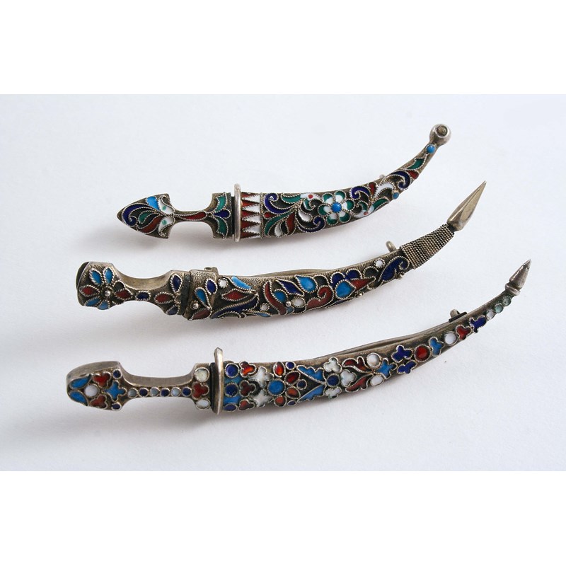 THREE EARLY 20TH CENTURY RUSSIAN CLOISONNE ENAMELLED BROOCHES each in the form of a dagger in its scabbard; the longest one 3" (7.7 cms) long; 0.7 oz (3)