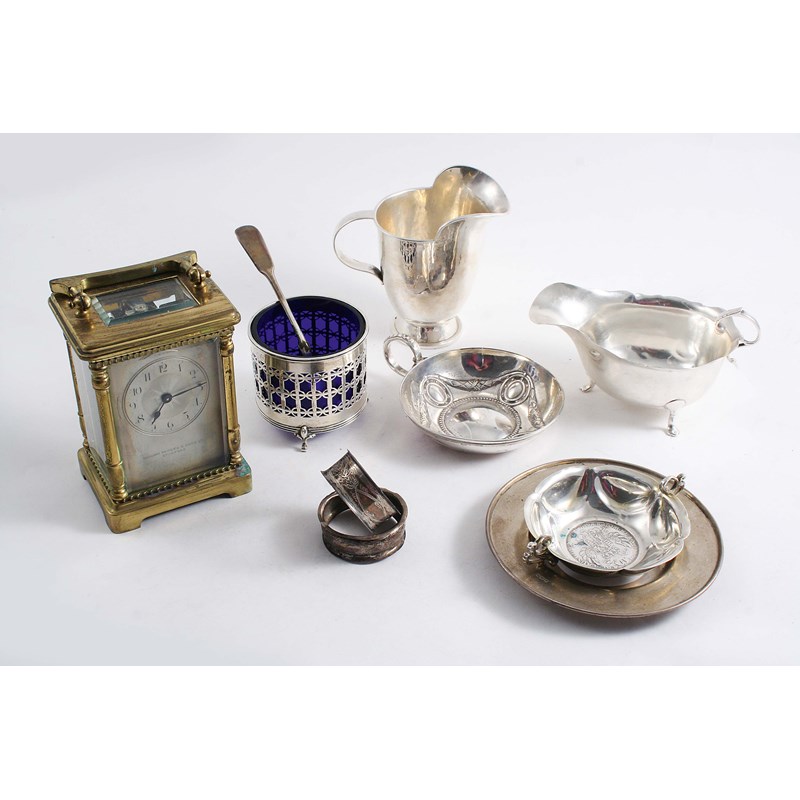 A German cream jug, a saucer, two napkin rings, two small dishes, a sauce boat, a pot (with a blue glass liner), a plated spoon and a brass carriage timepiece; the latter 4.75" (12 cms) high; 15 oz weighable silver (lot)