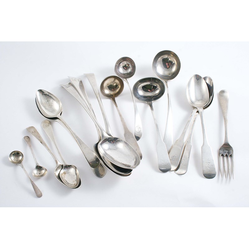 Three Inverness dessert spoons, an Aberdeen toddy ladle, two dessert spoons, a tea spoon, an Edinburgh toddy ladle, two Glasgow salt spoons and the following unascribed: two toddy ladles, three table spoons, a tea spoon & a dessert fork; 17.1 oz (17)