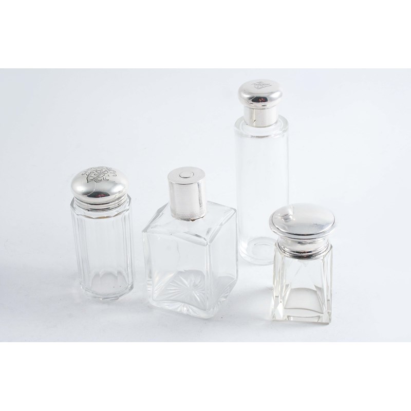 FOUR VARIOUS MOUNTED CLEAR GLASS TOILET WATER BOTTLES (Two monogrammed), by various makers, mixed dates, 1903-1932, the largest one 5.5" (13.5 cms) high (4)