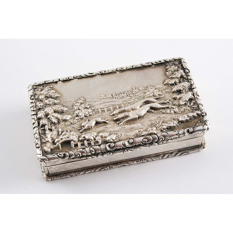 with raised borders & engine-turned border decoration, the cover inset with a plaque depicting a hare-coursing scene in relief, gilt interior, by John Tongue, Birmingham 1839; 3" (7.6 cms) long; 3.4 oz