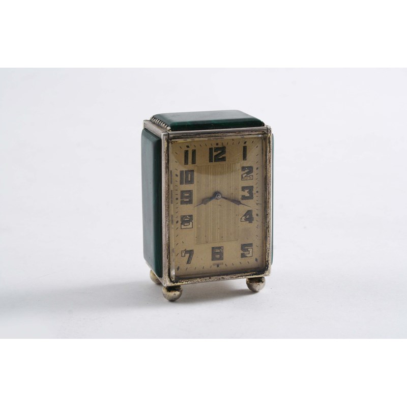 A SMALL GERMAN ART DECO BOUDOIR TIMEPIECE silvergilt with malachite panels & ball feet (with a jewelled Swiss movement); 2" (5 cms) high