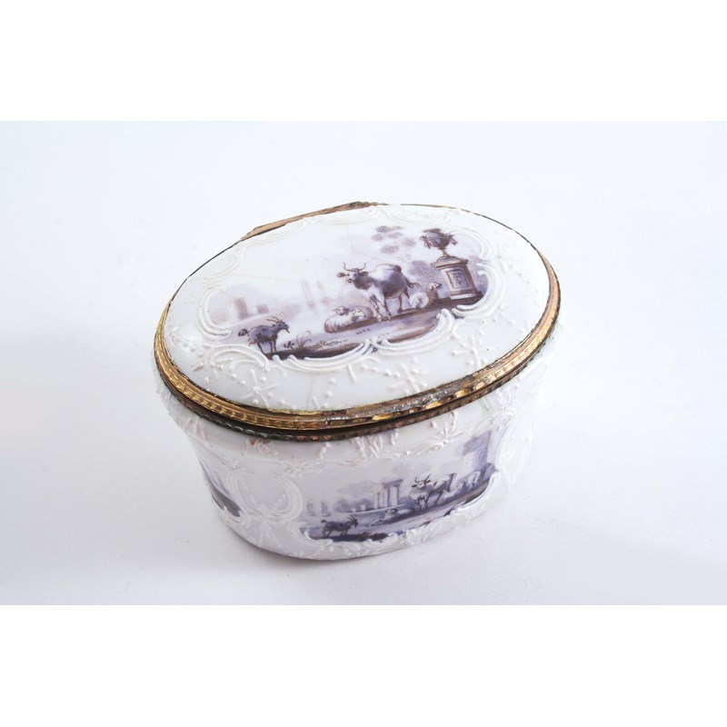 A LATE 18TH CENTURY CONTINENTAL GILT-METAL MOUNTED PORCELAIN BONBONNIERE decorated with painted monotone pastoral vignettes against a white ground, unmarked c.1785; 3.1" (8 cms) long