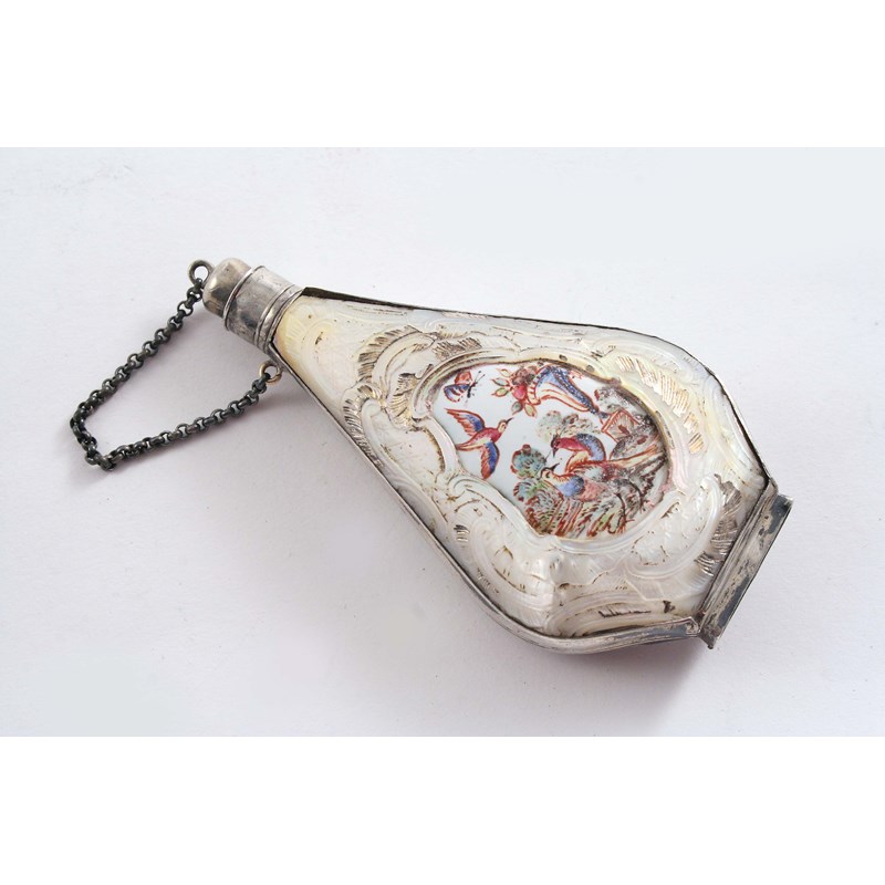 A MID 18TH CENTURY FRENCH MOUNTED MOTHER OF PEARL SCENT FLASK with an engraved drop-shaped body, the sides inset with a painted porcelain panel, pull-off "plug" cover, struck only with a French discharge mark for Paris 1750-56; 3.75" (9.5 cms) high