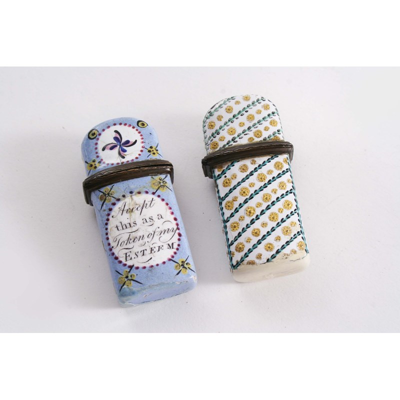 A LATE 18TH CENTURY ENAMELLED COPPER SCENT BOTTLE CASE inscribed "Accept this as a token of my esteem" (glass bottle with stopper inside) and another (lacking bottle); 2.2" (5.5 cms) high (2)