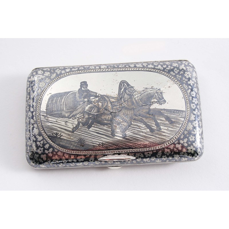 A LATE 19TH CENTURY RUSSIAN NIELLOWORK CIGARETTE CASE of rounded oblong form with a troika scene on the cover & vacant cartouche on the reverse, gilt interior, maker's mark "GK", Moscow 1890; 3.1" (8 cms) long; 2.25 oz