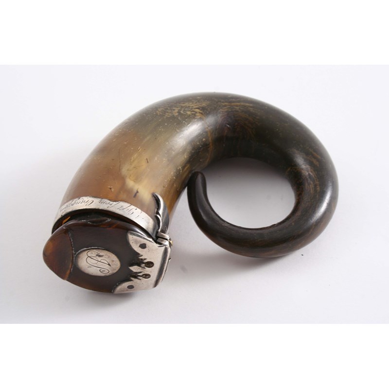 AN 18TH CENTURY SCOTTISH MOUNTED CURLY HORN SNUFF MULL initialled "JS" & inscribed around the rim "A gift from Organgefeild to the old Goodman of Ochiltree", crested, unmarked 1740-50; 4.9" (12.5 cms) long