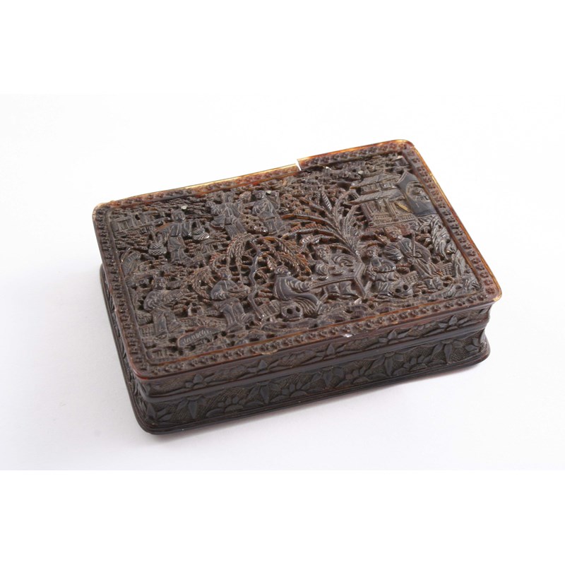 A MID 19TH CENTURY CHINESE CARVED TORTOISESHELL OBLONG SNUFF BOX, 1830-50 (A/F); 3.75" (9.5 cms) long