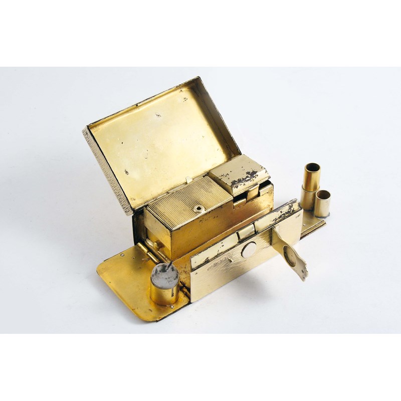 oblong with a textured finish & a gilt-metal interior with candle & taper holders, a vesta compartment & an ink bottle holder, by Albert Barker, London 1909; 3.2" (8 cms) long