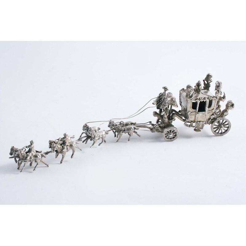 AN EARLY 20TH CENTURY CONTINENTAL MINIATURE MODEL OF A COACH & HORSES, pseudo marks, 1900-1920; 9.75" (24.8 cms) long; 7.5 oz