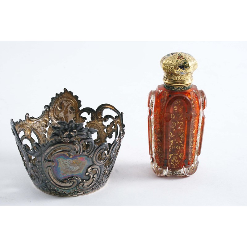 by Karl Faberge (work master's mark "I.P."), St. Petersburg 1896-1908 together with a Victorian gold-mounted red glass scent bottle, the mount with enamel & the bottle with gilding, unmarked c.1850; the latter 3.5" (9 cms) long; 2.4 oz weighable silver (2)