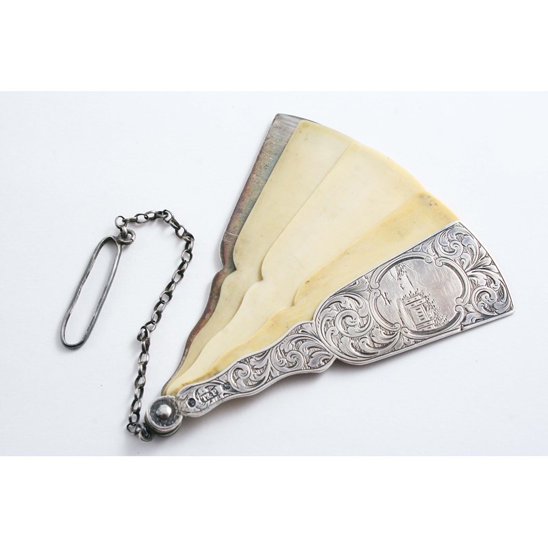 with three ivory leaves 7 a suspensory chain, the front with a view of a castle by a lake, by Taylor & Perry, Birmingham 1847; 3.3" (8.5 cms) long