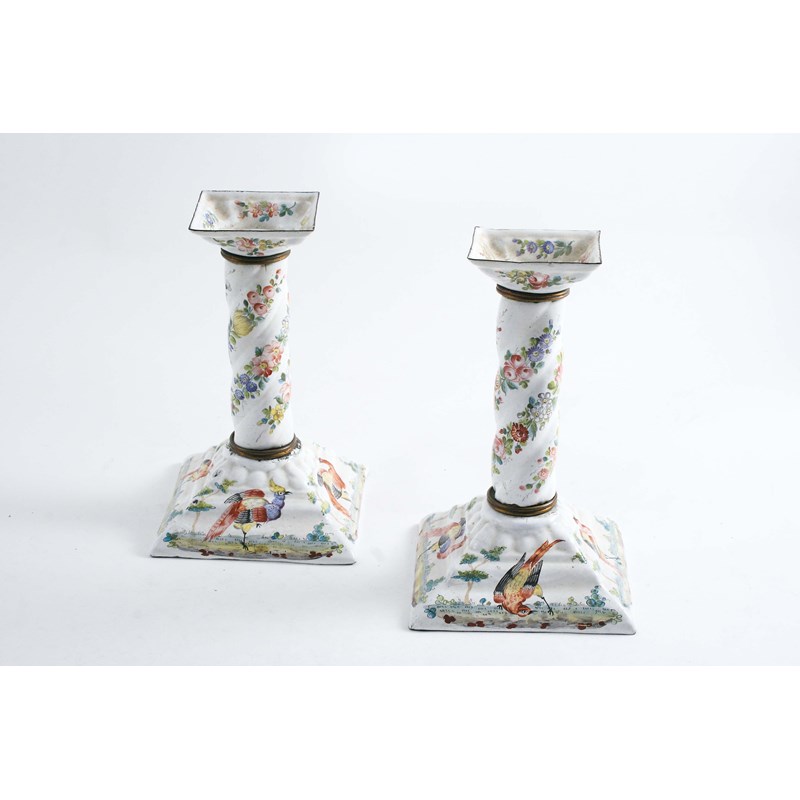 A PAIR OF EARLY 19TH CENTURY ENAMELLED COPPER CANDLESTICKS