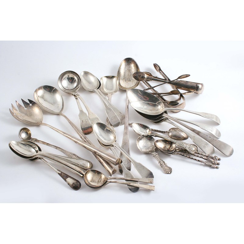 A pair of Edwardian salad servers, eleven various tea spoons, two egg spoons, a condiment/cream ladle, a caddy spoon, a basting spoon, a table spoon, a sugar spoon, five dessert spoons, five pairs of sugar tongs, two other small spoons & two plated sauce ladles, mixed makers & dates (some Scottish); 31.2 oz (lot)