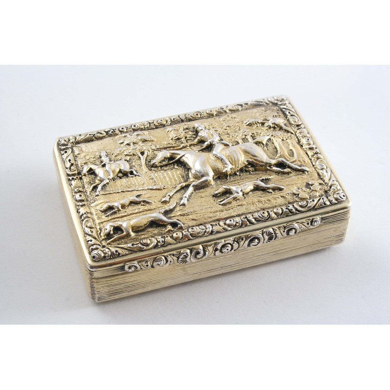 with reeded sides & an engine-turned base, the cover decorated in high relief with a hunting scene; the riders & hounds in full cry, by Edward Smith, Birmingham 1833; 3.55" (9 cms) long; 7.5 oz