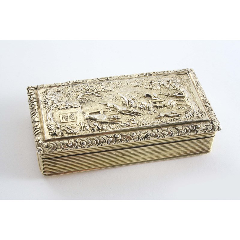 A WILLIAM IV SILVERGILT SNUFF BOX with reeded sides, an engine-turned base and a hare coursing sceen on the cover in relief, within a raised border, maker's mark "WS", Birmingham 1830; 3.8" (9.6 cms) long; 6.3 oz