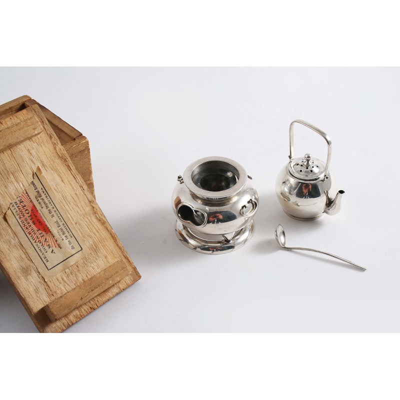 in the form of a kettle on stand, the kettle forming the pepper caster, the stand for salt (with glass liner & spoon) by Asahi Shoten of Yokohama c.1900 (boxed); 3.5" (9 cms) high; 1.7 oz
