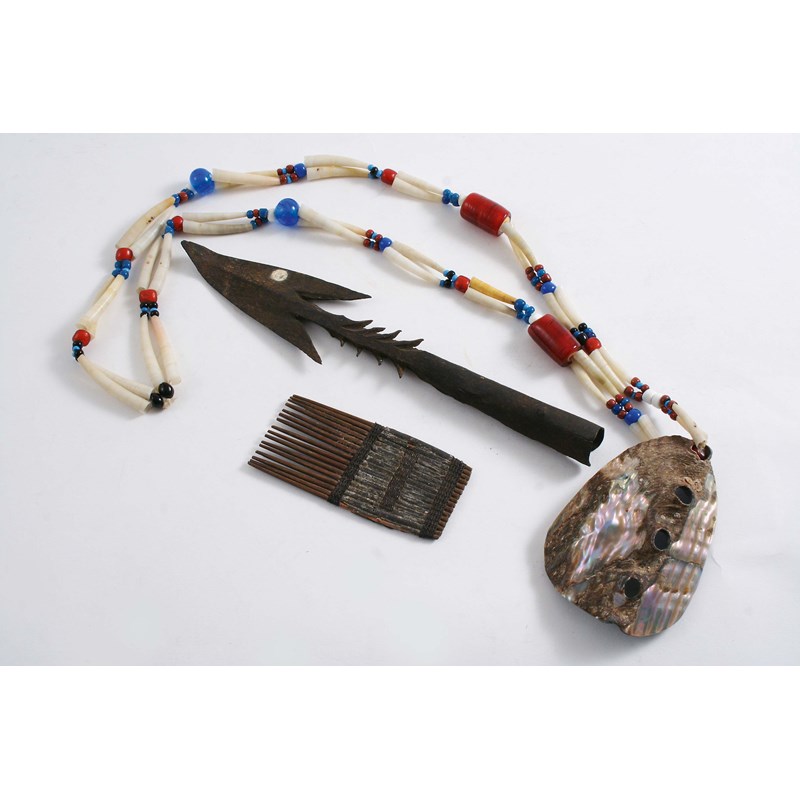 A TRIBAL SHELL & BEAD NECKLACE a hair comb and a barbed iron fishing spear head; the latter 7" (17.5 cms) long (3)