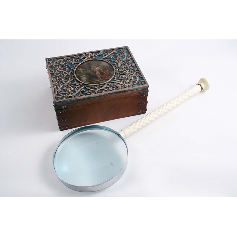 the cover with pierced work over an enamelled ground, centred by a painted miniature behind glass, together with a chrome plated, ivory handled magnifying glass; the box 6.9" (17.5 cms) long (2)