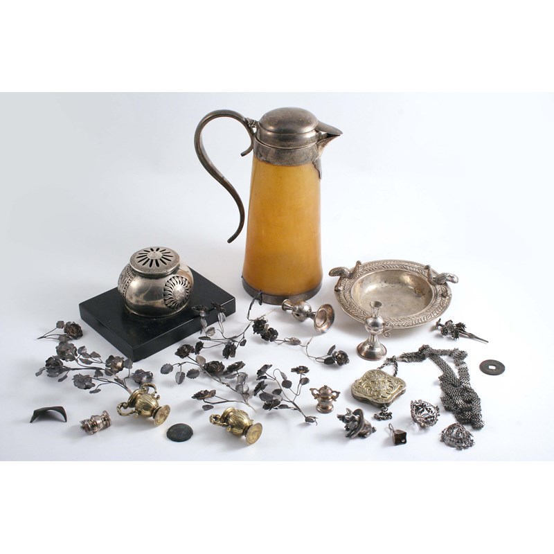 A Victorian mounted horn jug with a tapering body, a small South American dish, a Far Eastern incense burner on a marble base & a miscellany of small component parts; the jug 8.6" (22 cms) high; 16 oz weighable silver (lot)