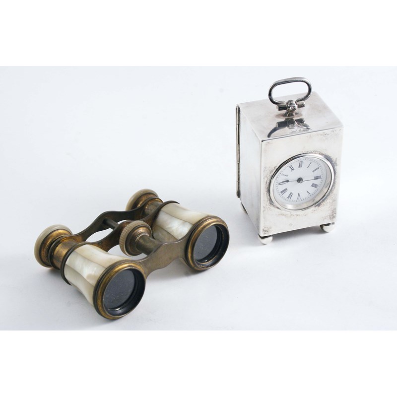 A LATE VICTORIAN BOUDOIR CARRIAGE TIMEPIECE on ball feet, with a swing handle, maker's mark worn, London 1890 and a pair of gilt-metal & mother-of-pearl opera glasses; the former 3.5" (9 cms) high (2)