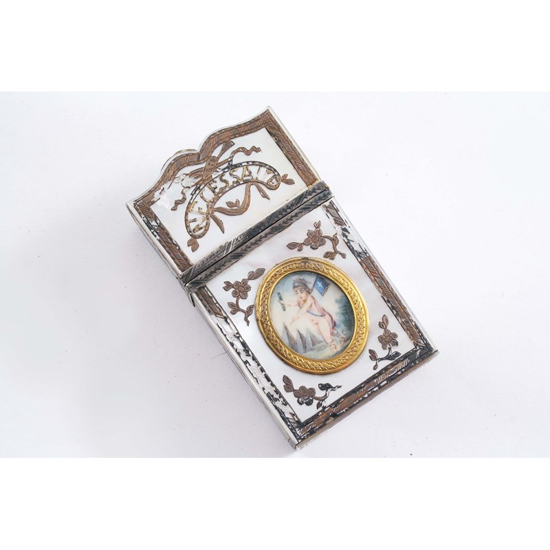 AN EARLY 19TH CENTURY MOTHER OF PEARL "SOUVENIR NECESSAIRE" with a hinged cover, engraved & gilded decoration and an inset miniature portrait of a putto on one side (behind glass); 3.4" (8.5 cms) long