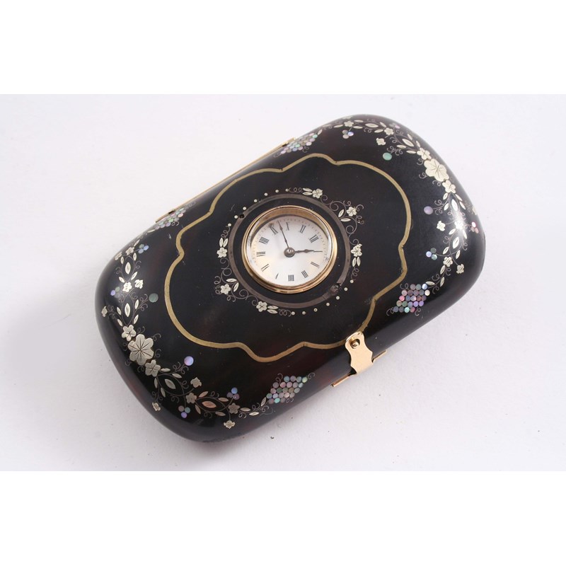 with a timepiece inset in the cover, white enamelled dial & Roman numerals, silk lining, monogrammed on the reverse c.1870; 3.5" ( 9 cms) long