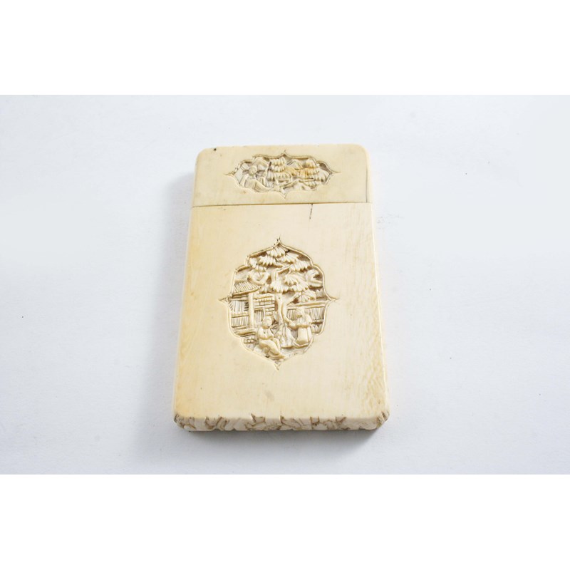 A CHINESE IVORY CARD CASE carved with panels of figures; 9.5 x 5.5 cms