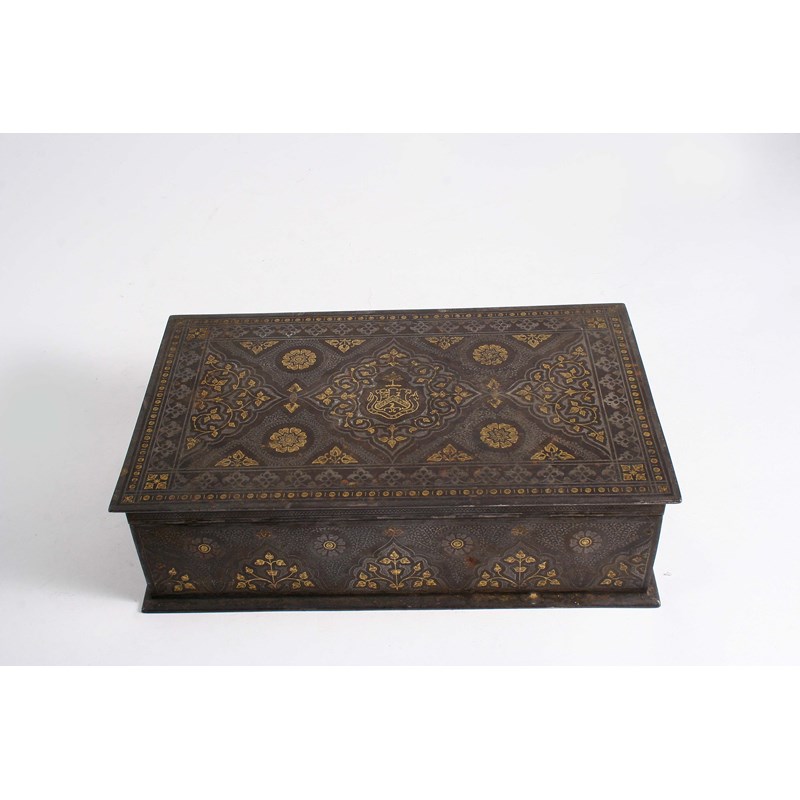 AN INDIAN IRON CIGAR BOX inlaid in gold & silver with formal designs, c.1900; 22 cms