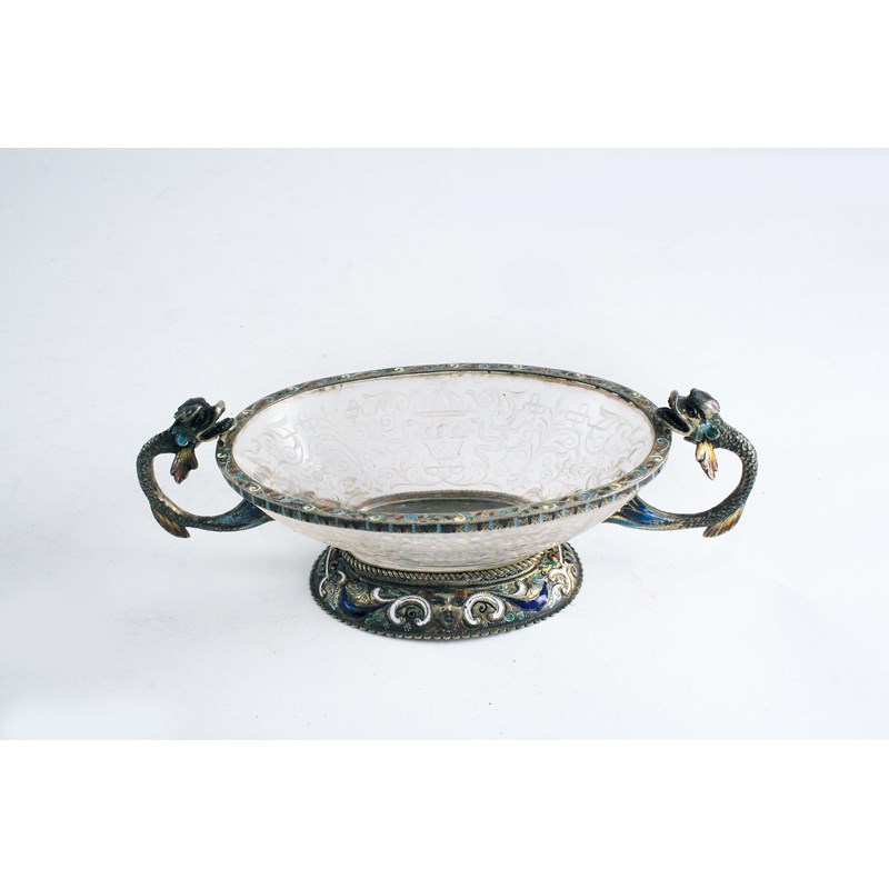 A CRYSTAL BOWL The oval body cut with baskets of flowers, snakes and grotesques in silver gilt and enamel mounts with serpent handles, Austro Hungarian, late 19th century; 17.5 cms wide