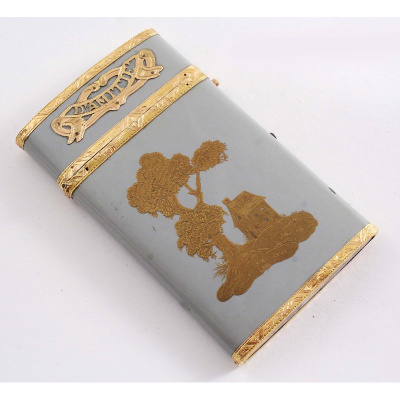 A LATE 18TH CENTURY FRENCH GOLD-MOUNTED DOVE-GREY LACQUERED "SOUVENIR D'AMITIE" containing a folding bone tablet & a mounted pencil, fully marked but marks indistinct on bezel; 3.4" (8.5 cms) long