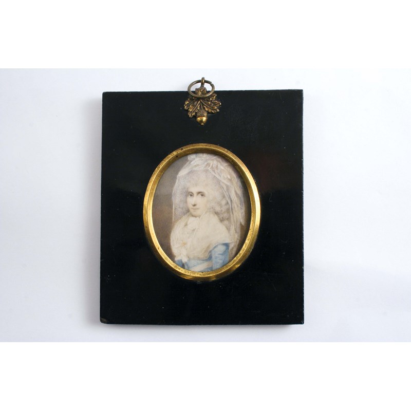 ENGLISH SCHOOL LATE 18TH CENTURY A miniature portrait of a lady with elaborately dressed hair, half length on ivory; 6 x 5 cms