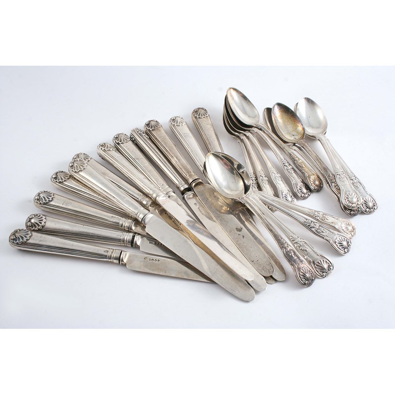 crested by William Chawner, London 1825 and a matched set of twelve George IV/William IV Thread & Shell pattern dessert knives, crested & loaded, also by William Chawner, London 1826/1831; 15 oz weighable silver (25)