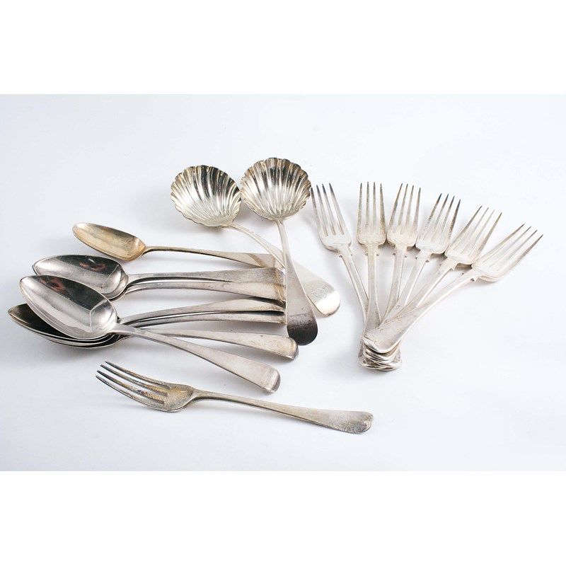 Old English pattern with shoulders, by John James Whiting, London 1849 together with two George III sauce ladles, crested, a George III Old English dessert fork, crested and seven George III / IV Old English pattern dessert spoons; 23.9 oz (16)